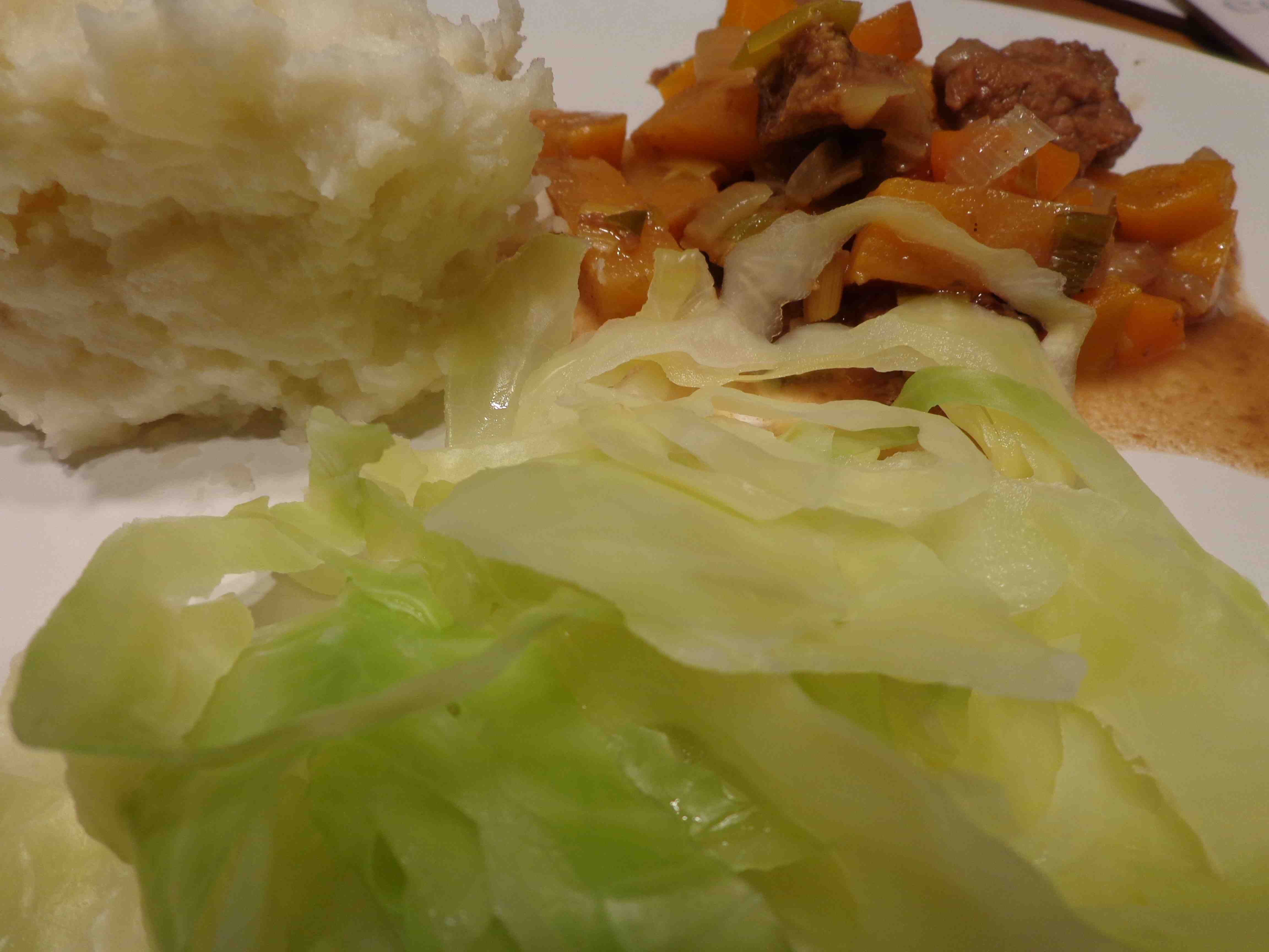 Another three course meal for dinner tonight. We started with cauliflower soup. (I’ve made rather a lot of it, so we’re going to be eating it for a couple of days!) That was followed by a beef casserole, cooked in the slow cooker, served with mashed potatoes and cabbage. It was the first cabbage, other than raw, that I’ve eaten voluntarily since I was a child. You know what? If you cook it in barely any water and add some butter – as instructed on the wartime video, 2 Cooks and a Cabbage, I posted a couple of days ago – it isn’t bad at all. And then pudding – yay! I made baked apples, as per The Glasgow Cookery Book, stuffing them with a mix of sultanas and the delicious golden syrup I bought this morning. Am I full? You bet!