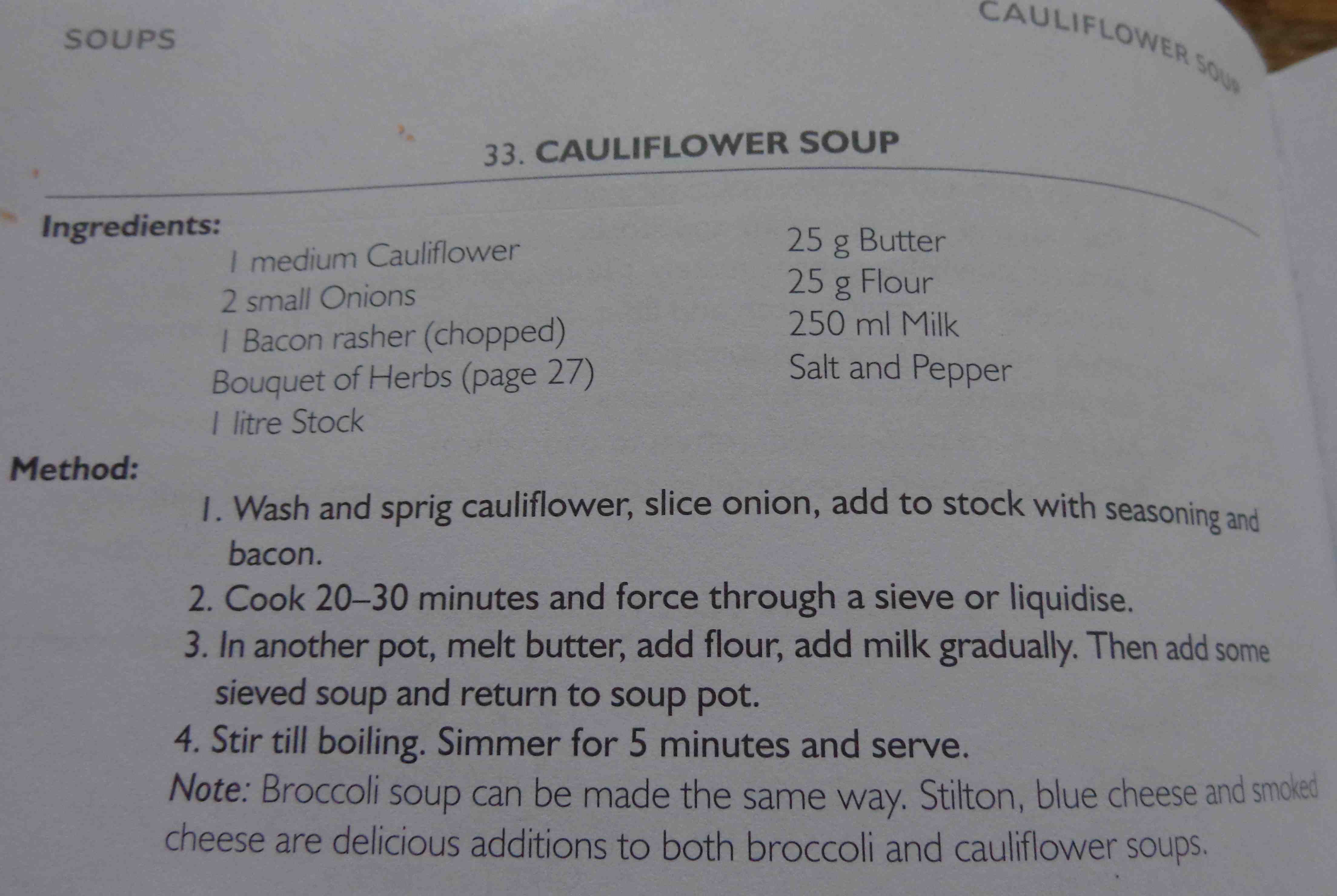 It’s snowing really heavily here, so for lunch I made myself a hot bowl of cauliflower soup from The Glasgow Cookery Book with a bacon sandwich on the side. I have to say, the bacon ration is the saving grace of this whole process. Wartime food can seem so bland, but just adding a rasher of bacon to the soup or sandwich is great on the taste buds! I did adjust the soup recipe a little – I didn’t have a bouquet garni, so I just used a bay leaf, and used one leek instead of the second onion – but it tasted great.