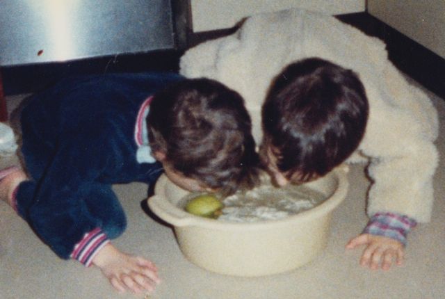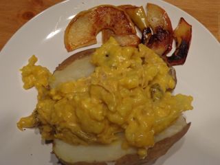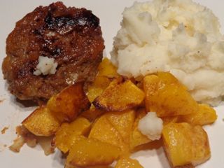 So my last entry for this experiment was the final dish I made with the remains of my ground beef ration for this week; meatballs made with the same ingredients as the burgers (chopped onion, breadcrumbs, seasoning, bound with tomato sauce), baked in the oven at 180C for 20 minutes and then covered in gravy. On the side, home-made fries and my newest favourite, shredded cabbage fried in a little bacon fat. For dessert, we chopped up and shared the remaining toffee apple. Given that November 1st brought snow here in Calgary, reminding us that winter has finally arrived, it really was the perfect comfort food.